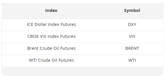 Futures are one of the most popular form of CFDs. FastFX offers a range of Futures from around the world, including ICE Dollar Index and CBOE VIX Index.